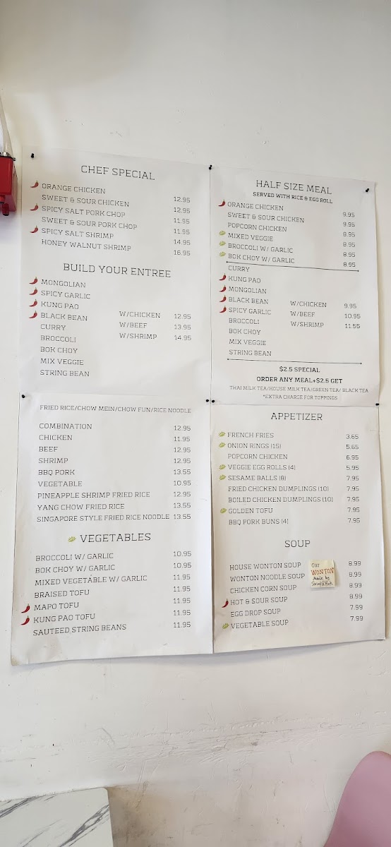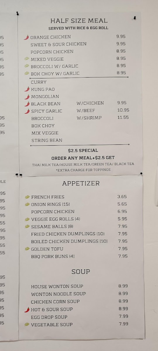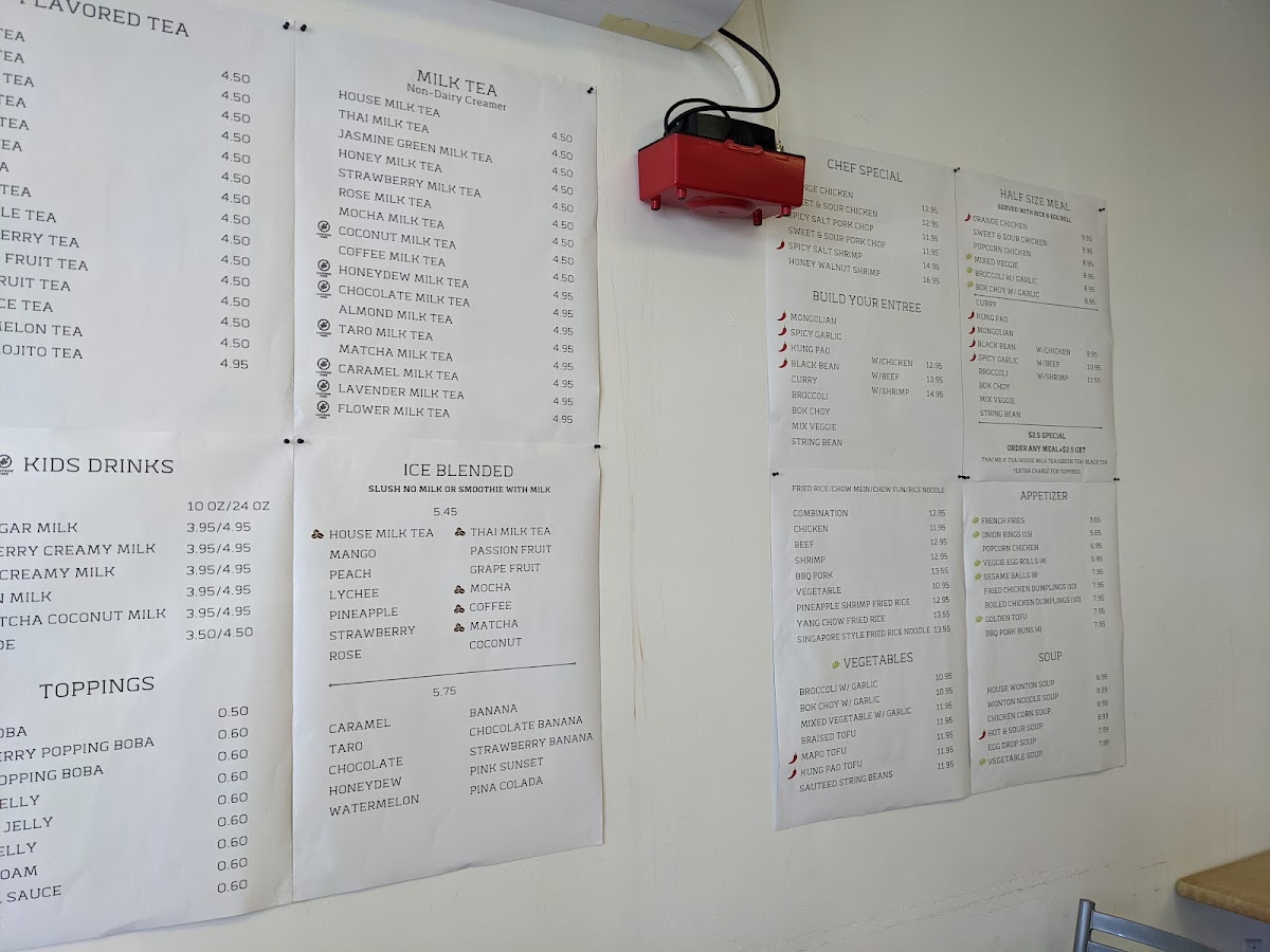 From a reviewer's perspective, the menu at Favoritea | Bobawok offers an impressive and diverse selection that caters to a wide range of tastes. The Ice Blended drinks, like Honeydew Ice Blended and Raspberry Ice Blended, provide refreshing options, alongside unique flavors such as Matcha Ice Blended and Passion Fruit Ice Blended. Tea lovers can enjoy Flavored Green/Black Tea choices like Peach Mojito Tea, Kiwi Tea, and White Peach Tea, while the Milk Tea lineup features inventive blends including Mocha Milk Tea, Honey Green Milk Tea, and Rose Milk Tea. The restaurant’s Half Size Meal / Combo options, including Mongolian With Protein - Meal and Popcorn Chicken - Meal, are perfect for those seeking a satisfying yet manageable portion, complemented by flavorful soups like Hot & Sour Soup and Chicken Corn Soup. Appetizers such as ShuMai (4), Veggie Spring Rolls, and the indulgent Mozzarella Sticks (8) provide shareable starters, while New Items like Coconut Ball (5) and Fried Chicken Wings 12pc add an exciting twist to the menu. For main dishes, diners can explore Fried Rice / Chow Mein / Chow Fun options including Chow Fun, Fried Udon, and Singapore Style Fried Rice Noodle, or build a personalized entree with selections like Kung Pao Entree and Black Bean Entree. Vegetable options, from Broccoli With Garlic to String Bean With Garlic, ensure lighter yet flavorful accompaniments. Finally, the Chef Special offerings, such as Honey Walnut Shrimp, Orange Chicken, and Spicy Salt Pork Chop, stand out as signature dishes that highlight the kitchen’s skill in balancing bold flavors and textures. Overall, the menu at Favoritea | Bobawok blends creativity with familiarity, offering something for everyone-whether you’re in the mood for a sweet treat, a hearty meal, or a refreshing drink.